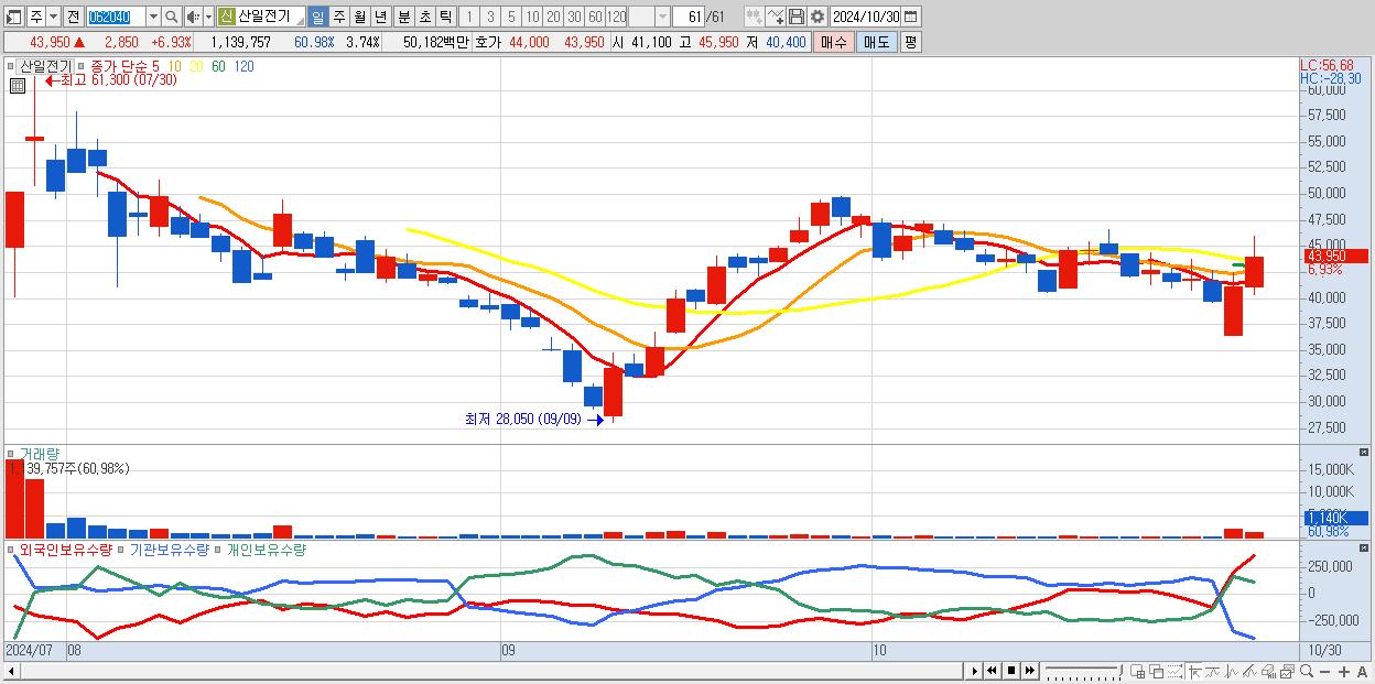 - 산일전기 (43,950원 ▲ 6.93% , 시총: 13,381억, 외국인 순매수 거래금:62억)