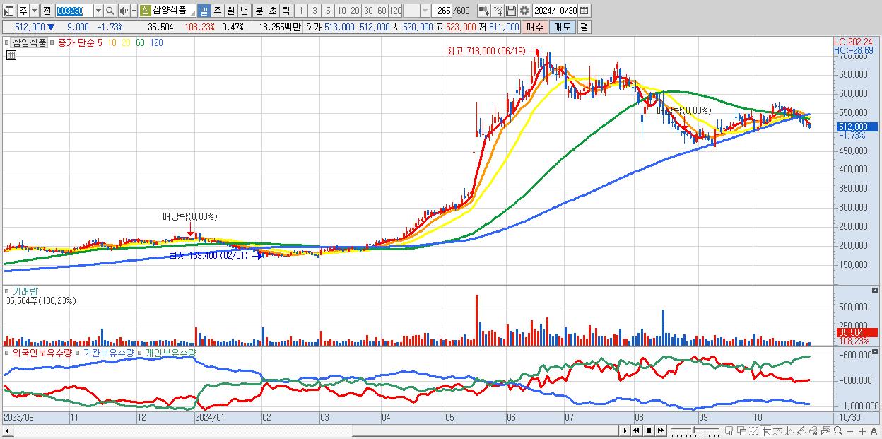 - 삼양식품 (512,000원 ▼ -1.73% , 시총: 38,569억, 외국인 순매수 거래금:25억)