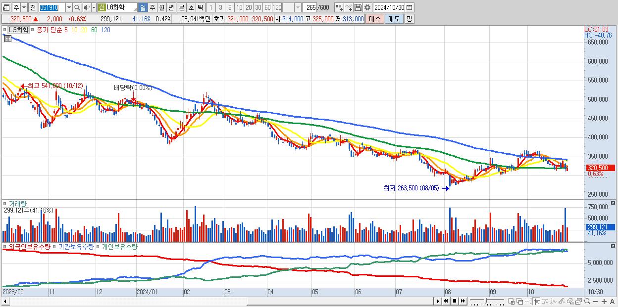 - LG화학 (320,500원 ▲ 0.63% , 시총: 226,248억, 외국인 순매수 거래금:59억)