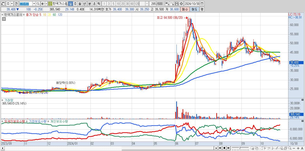 - 한국가스공사 (39,400원 ▼ -0.25% , 시총: 36,371억, 외국인 순매수 거래금:41억)