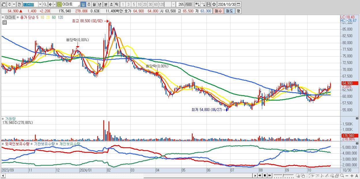 - 이마트 (64,900원 ▲ 2.2% , 시총: 18,091억, 외국인 순매수 거래금:39억)