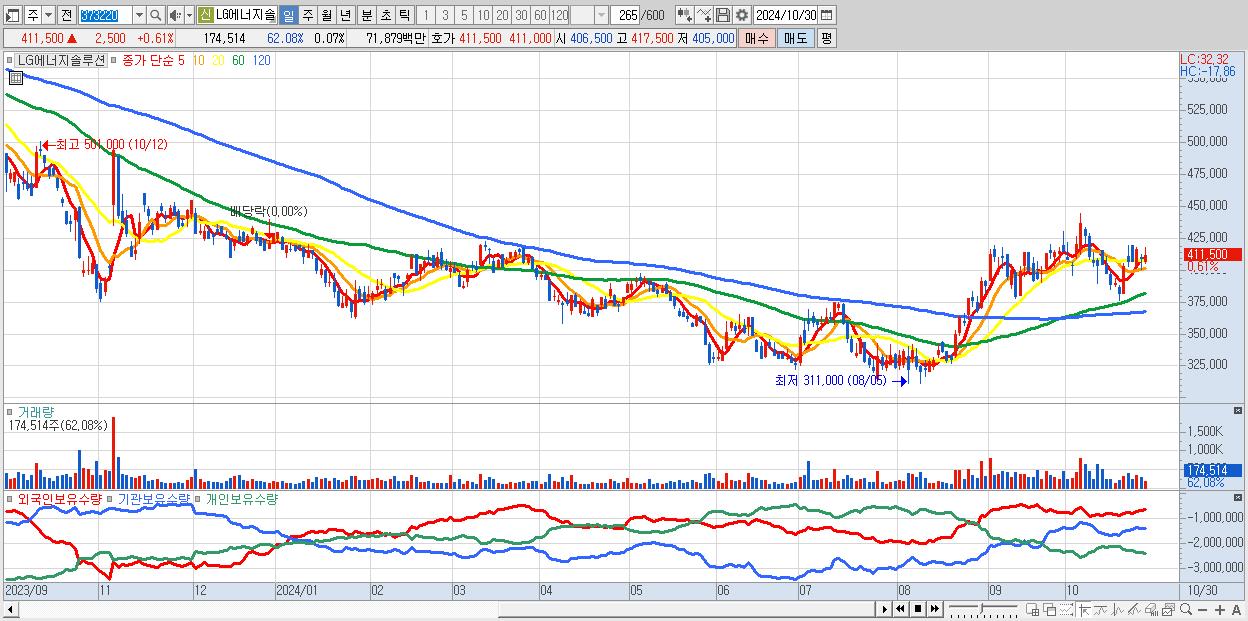 - LG에너지솔루션 (411,500원 ▲ 0.61% , 시총: 962,910억, 외국인 순매수 거래금:137억)