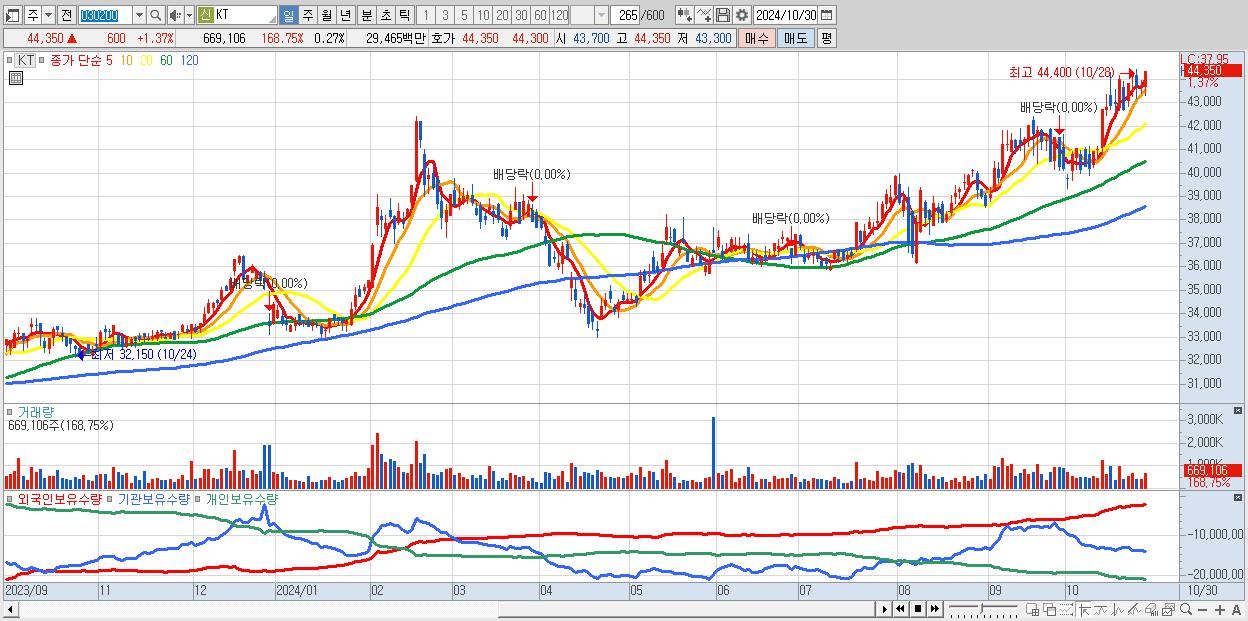 - KT (44,350원 ▲ 1.37% , 시총: 111,772억, 외국인 순매수 거래금:101억)