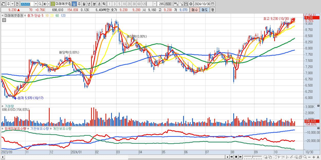 - 미래에셋증권 (9,230원 ▲ 0.76% , 시총: 54,948억, 거래량: 698,610, 거래대금:64억, KOSPI)