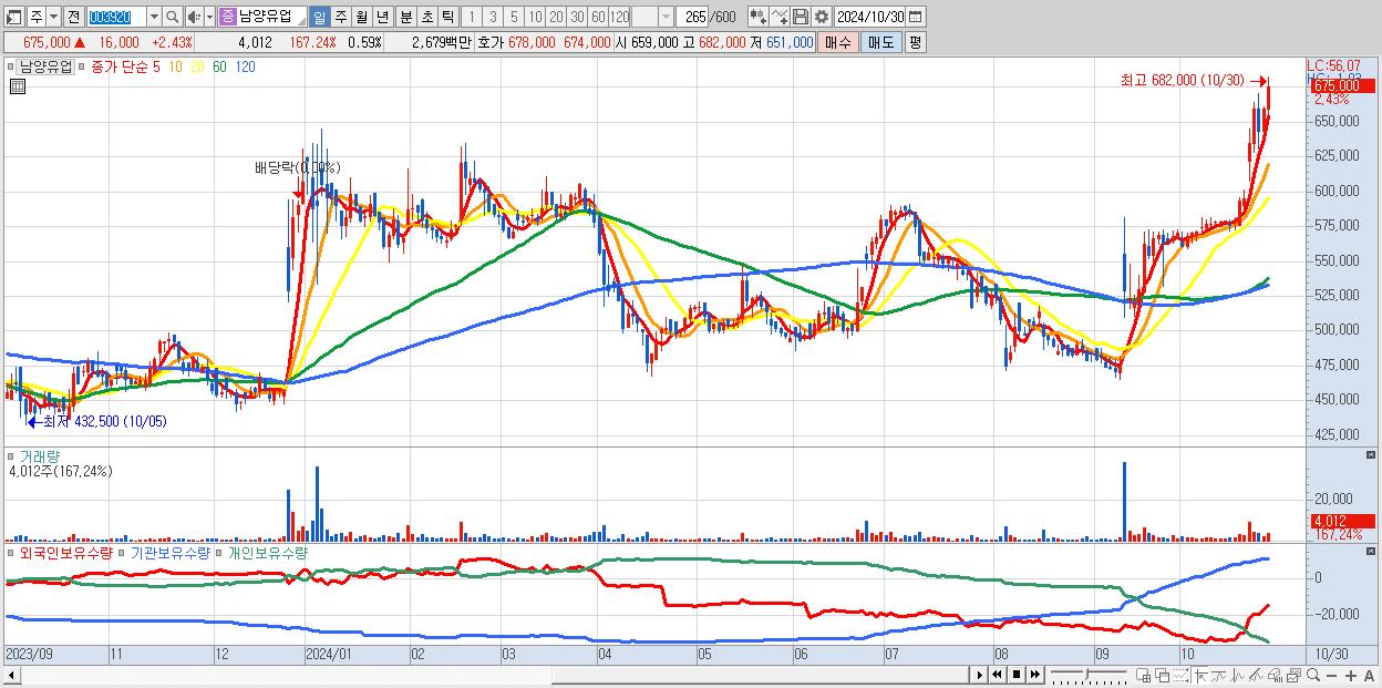 - 남양유업 (675,000원 ▲ 2.43% , 시총: 4,588억, 거래량: 4,012, 거래대금:27억, KOSPI)