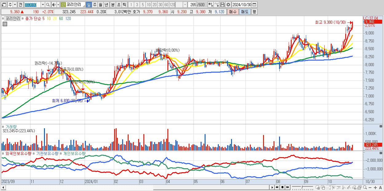 - 코리안리 (9,360원 ▲ 2.07% , 시총: 15,478억, 거래량: 323,245, 거래대금:30억, KOSPI)