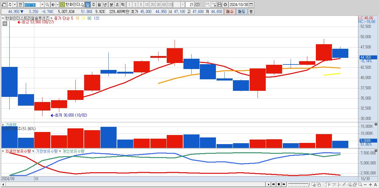 - 한화인더스트리얼솔루션즈 (44,950원 ▼ -6.74% , 시총: 22,695억, 거래량: 5,007,634, 거래대금:2,295억)