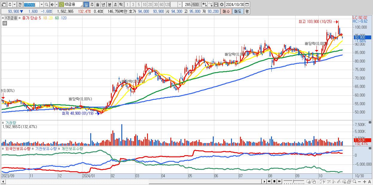 - KB금융 (93,900원 ▼ -1.68% , 시총: 369,523억, 거래량: 1,562,965, 거래대금:1,468억)