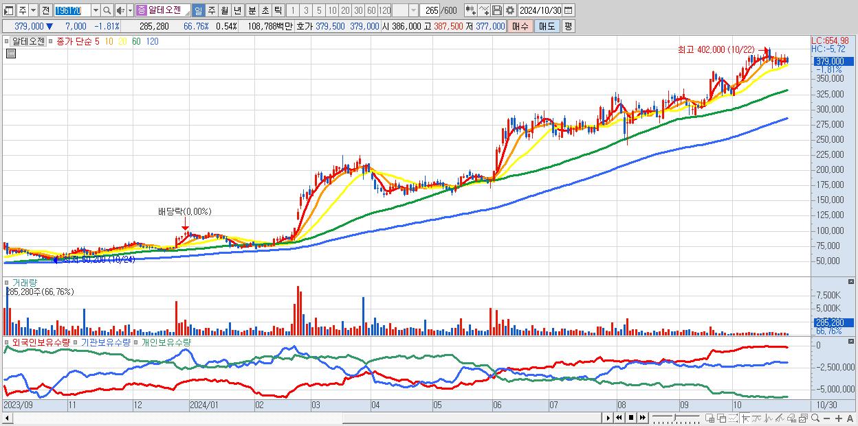 - 알테오젠 (379,000원 ▼ -1.81% , 시총: 202,078억, 거래량: 285,280, 거래대금:1,088억)