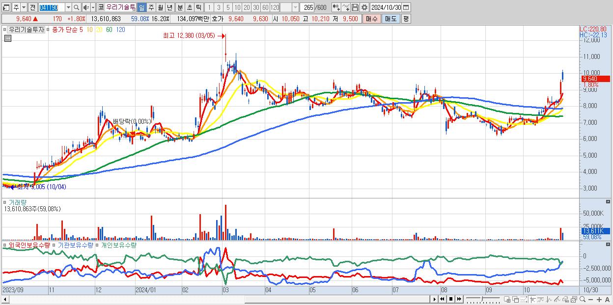 - 우리기술투자 (9,640원 ▲ 1.8% , 시총: 8,098억, 거래량: 13,610,863, 거래대금:1,341억)