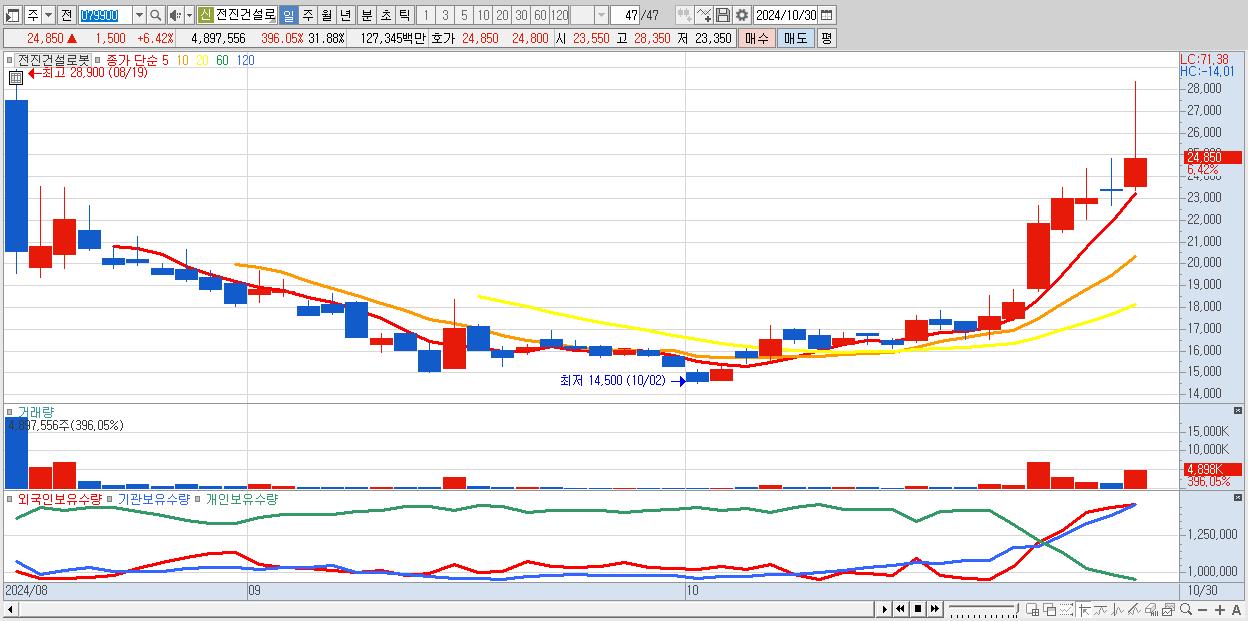 - 전진건설로봇 (24,850원 ▲ 6.42% , 시총: 3,817억, 거래량: 4,897,556, 거래대금:1,273억)