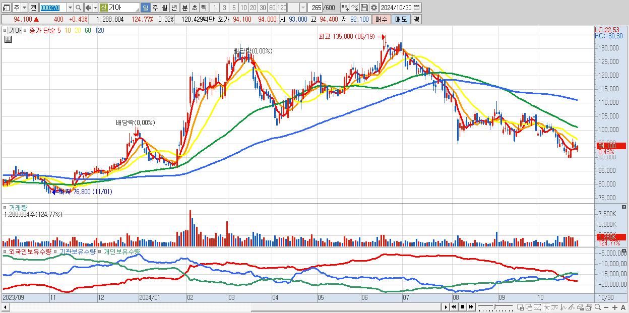 - 기아 (94,100원 ▲ 0.43% , 시총: 376,267억, 거래량: 1,288,804, 거래대금:1,204억)