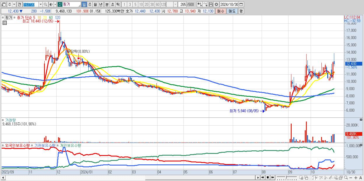 - 핑거 (12,430원 ▼ -1.58% , 시총: 1,164억, 거래량: 9,468,133, 거래대금:1,253억)