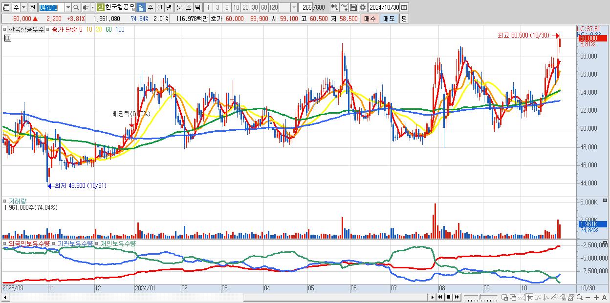 - 한국항공우주 (60,000원 ▲ 3.81% , 시총: 58,485억, 거래량: 1,961,080, 거래대금:1,170억)