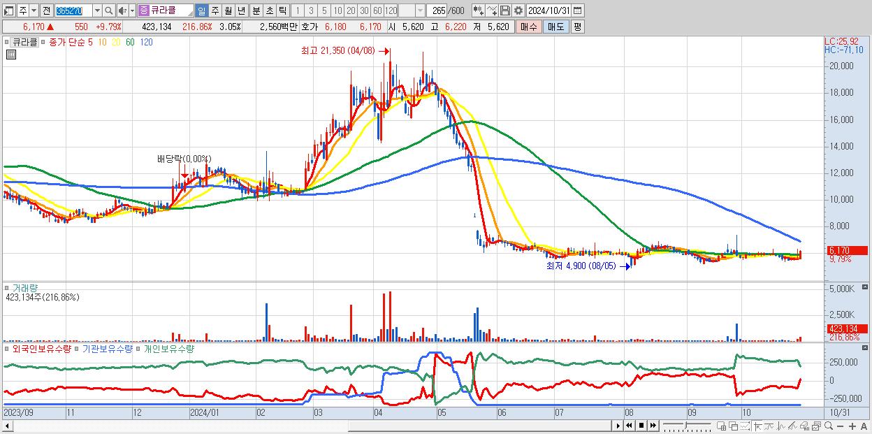 - 큐라클 (6,170원 ▲ 9.79% , 시총: 856억, 거래량: 423,134, 거래대금:26억)