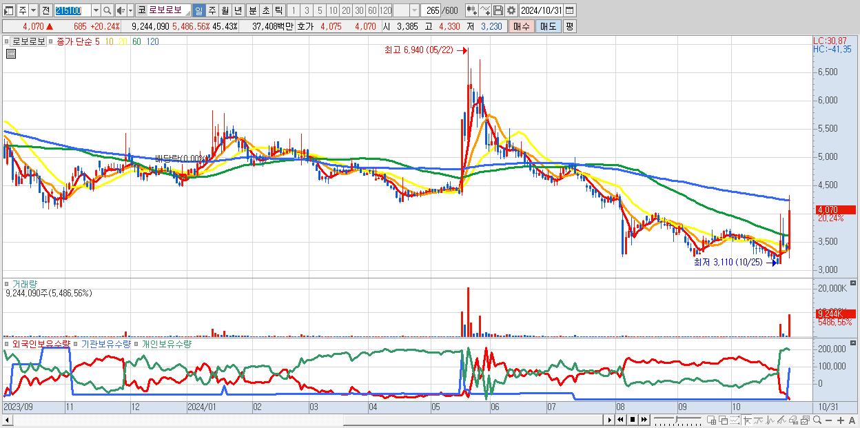 - 로보로보 (4,070원 ▲ 20.24% , 시총: 828억, 거래량: 9,244,090, 거래대금:374억)