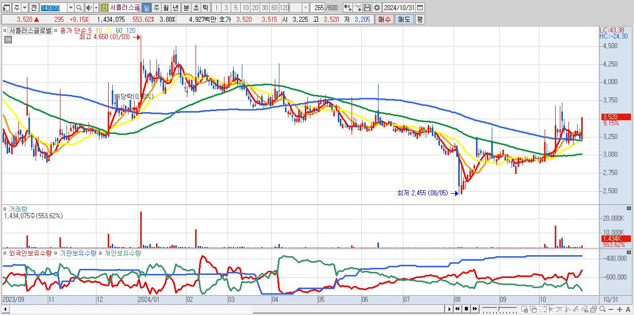 - 서플러스글로벌 (3,520원 ▲ 9.15% , 시총: 1,302억, 거래량: 1,434,075, 거래대금:49억)