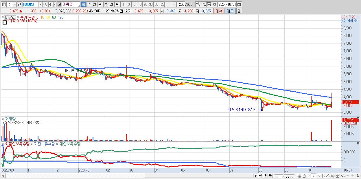 - 머큐리 (3,670원 ▲ 9.06% , 시총: 581억, 거래량: 7,373,352, 거래대금:289억)