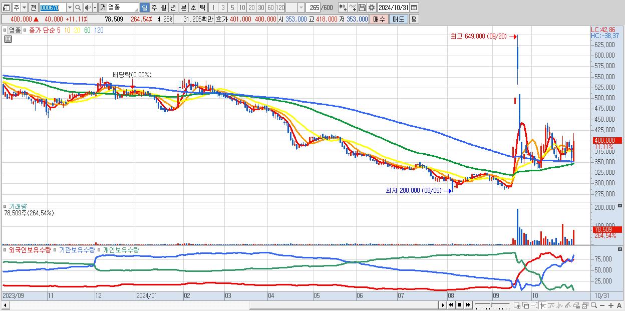 - 영풍 (400,000원 ▲ 11.11% , 시총: 7,368억, 거래량: 78,509, 거래대금:312억)