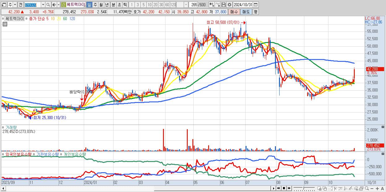 - 쎄트렉아이 (42,200원 ▲ 8.76% , 시총: 4,621억, 거래량: 278,452, 거래대금:115억)