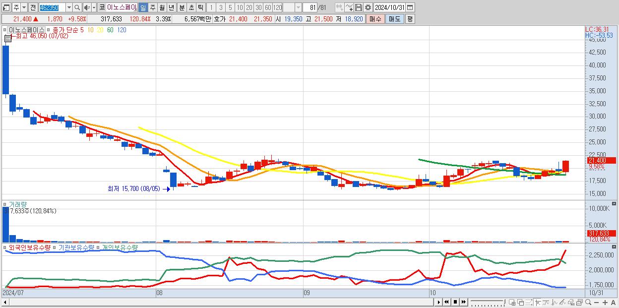 - 이노스페이스 (21,400원 ▲ 9.58% , 시총: 2,006억, 거래량: 317,633, 거래대금:66억)