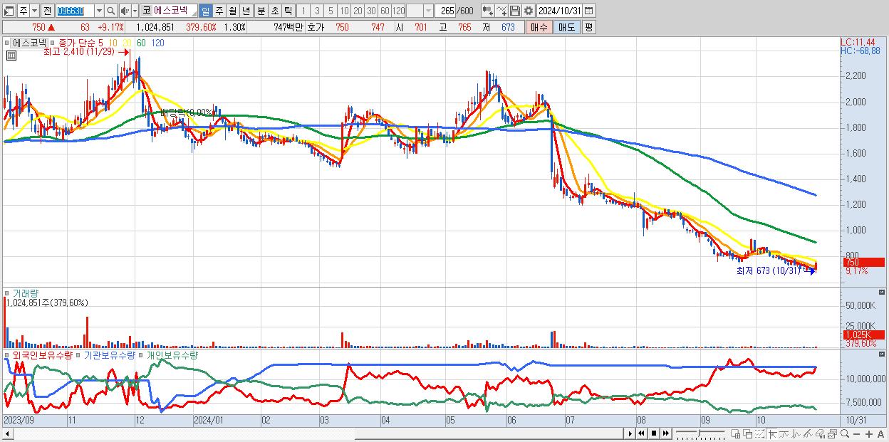 - 에스코넥 (750원 ▲ 9.17% , 시총: 593억, 거래량: 1,024,851, 거래대금:7억)