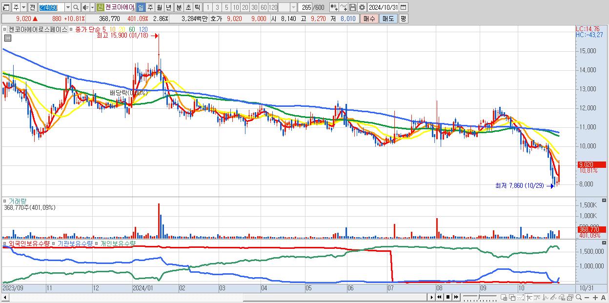 - 켄코아에어로스페이스 (9,020원 ▲ 10.81% , 시총: 1,165억, 거래량: 368,770, 거래대금:33억)