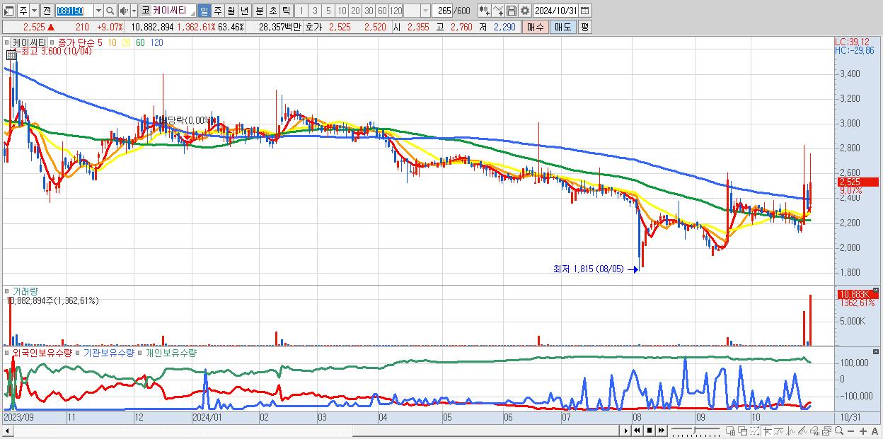 - 케이씨티 (2,525원 ▲ 9.07% , 시총: 433억, 거래량: 10,882,894, 거래대금:284억)