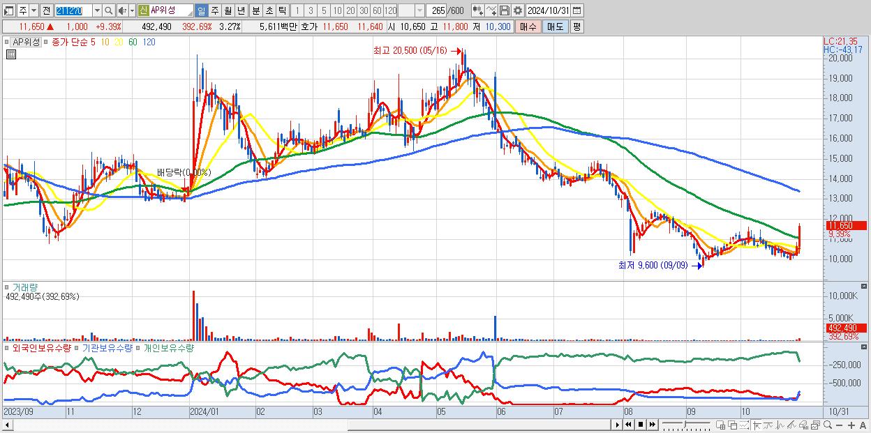 - AP위성 (11,650원 ▲ 9.39% , 시총: 1,757억, 거래량: 492,490, 거래대금:56억)