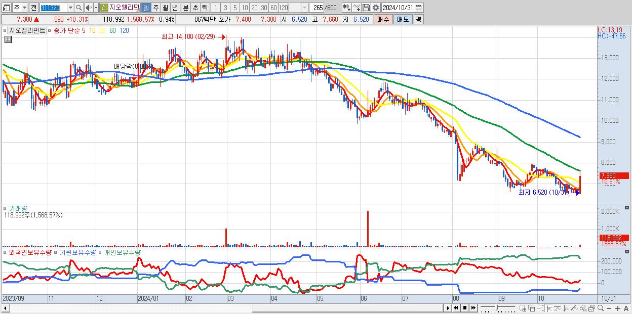 - 지오엘리먼트 (7,380원 ▲ 10.31% , 시총: 931억, 거래량: 118,992, 거래대금:9억)