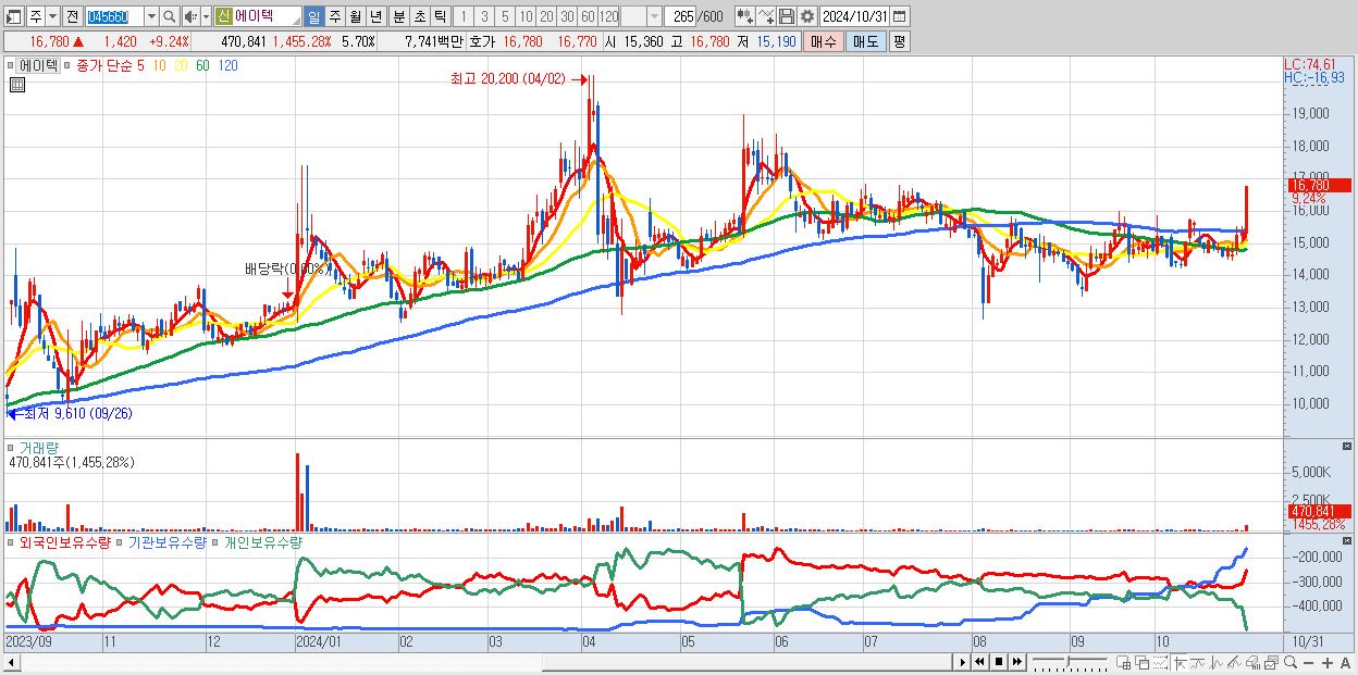 - 에이텍 (16,780원 ▲ 9.24% , 시총: 1,386억, 거래량: 470,841, 거래대금:77억)