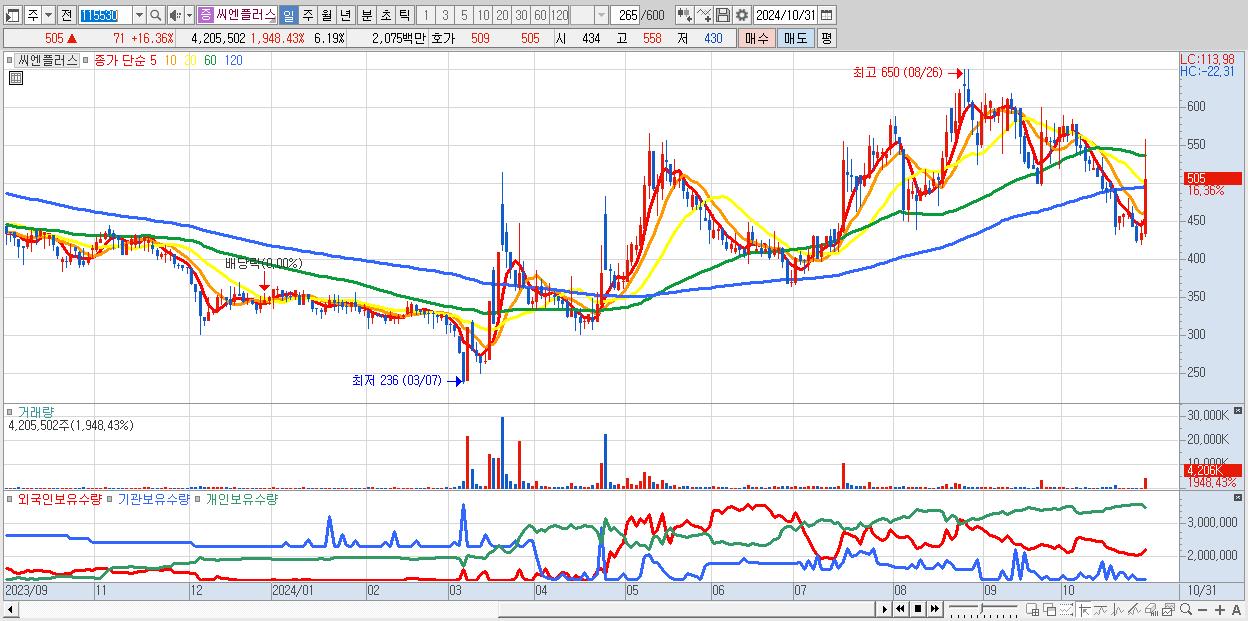 - 씨엔플러스 (505원 ▲ 16.36% , 시총: 343억, 거래량: 4,205,502, 거래대금:21억)