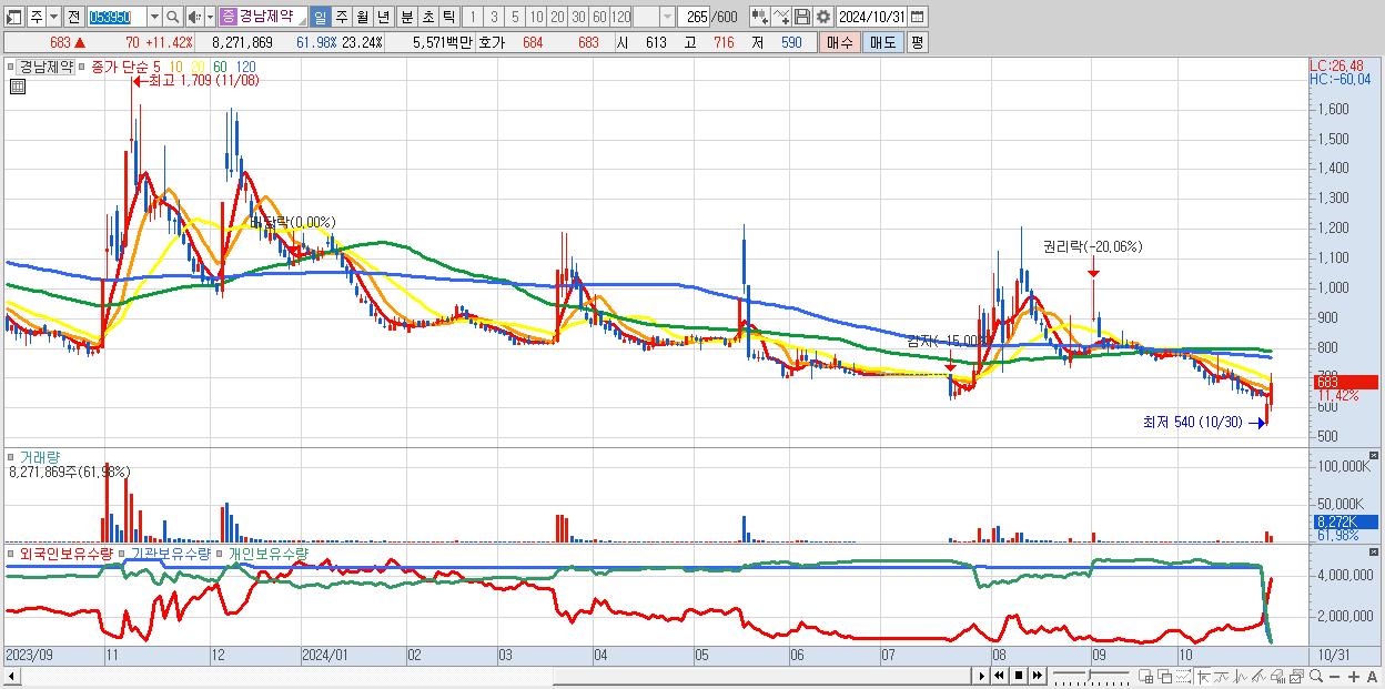 - 경남제약 (683원 ▲ 11.42% , 시총: 243억, 거래량: 8,271,869, 거래대금:56억)