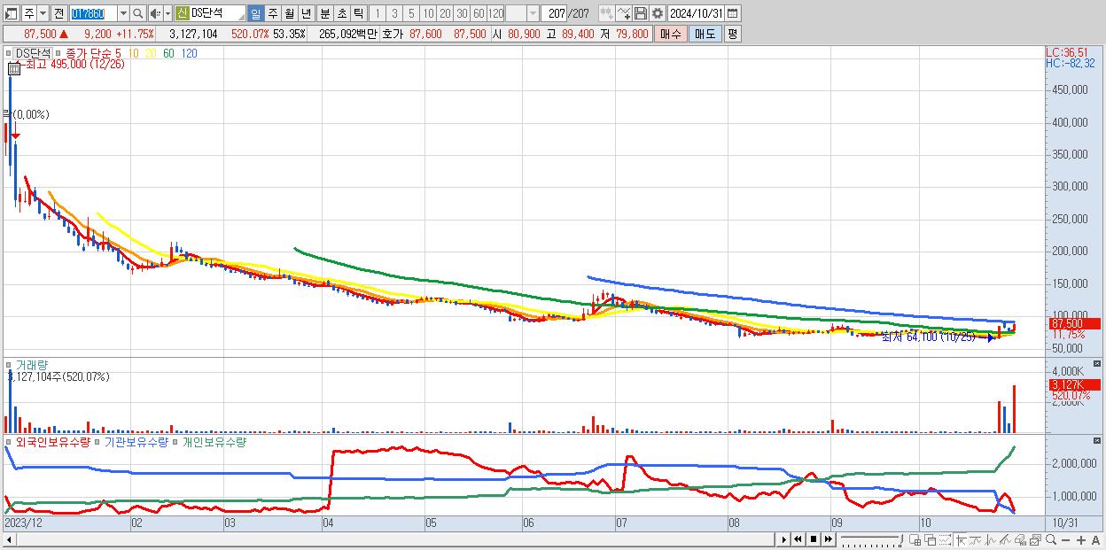 - DS단석 (87,500원 ▲ 11.75% , 시총: 5,129억, 거래량: 3,127,104, 거래대금:2,651억)