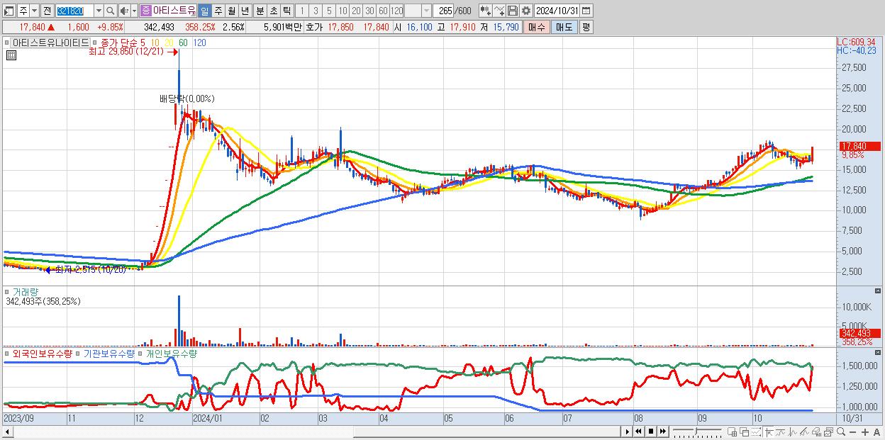 - 아티스트유나이티드 (17,840원 ▲ 9.85% , 시총: 2,385억, 거래량: 342,493, 거래대금:59억)