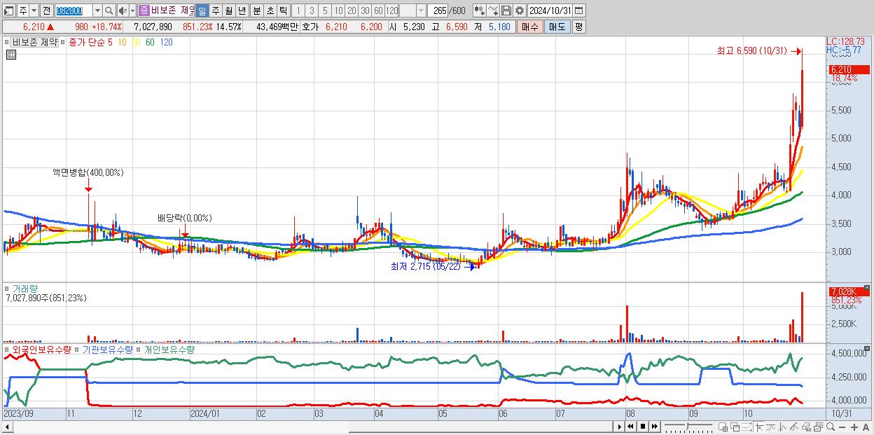 - 비보존 제약 (6,210원 ▲ 18.74% , 시총: 2,996억, 거래량: 7,027,890, 거래대금:435억)