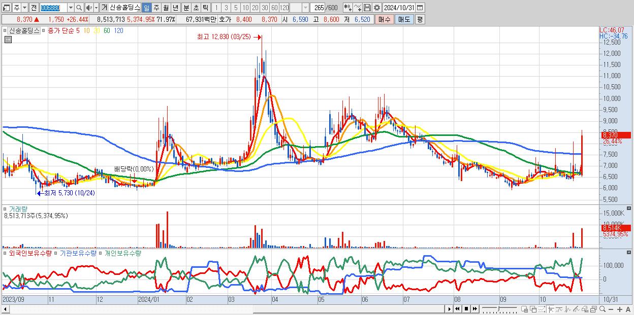 - 신송홀딩스 (8,370원 ▲ 26.44% , 시총: 990억, 거래량: 8,513,713, 거래대금:679억)