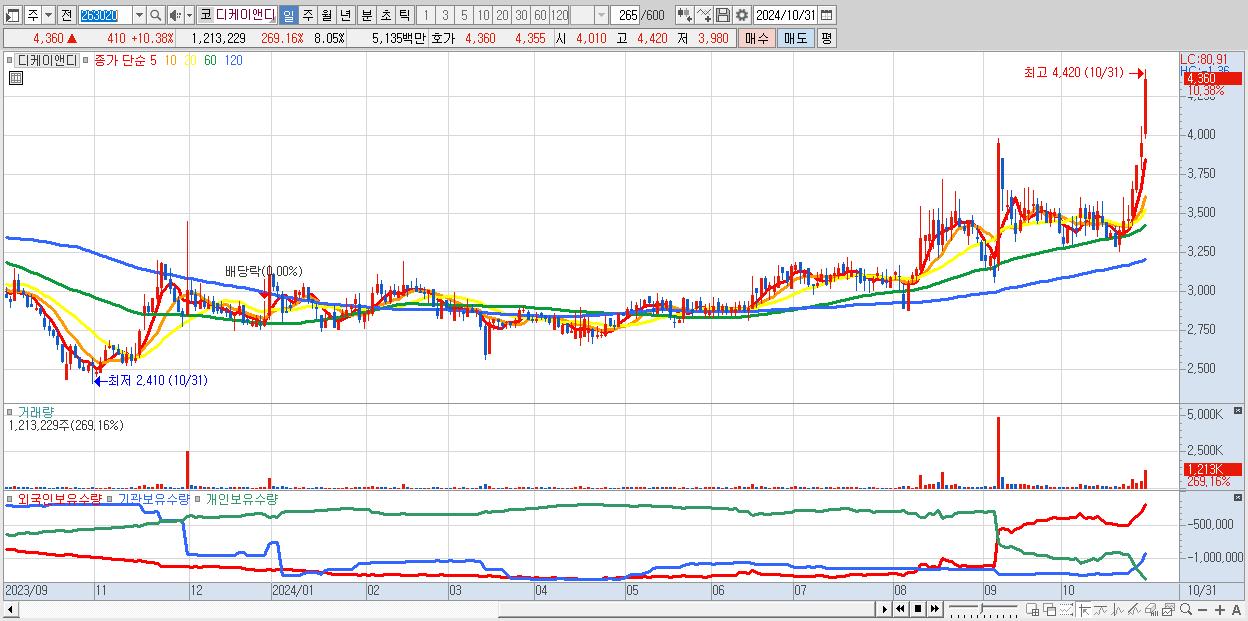- 디케이앤디 (4,360원 ▲ 10.38% , 시총: 657억, 거래량: 1,213,229, 거래대금:51억)