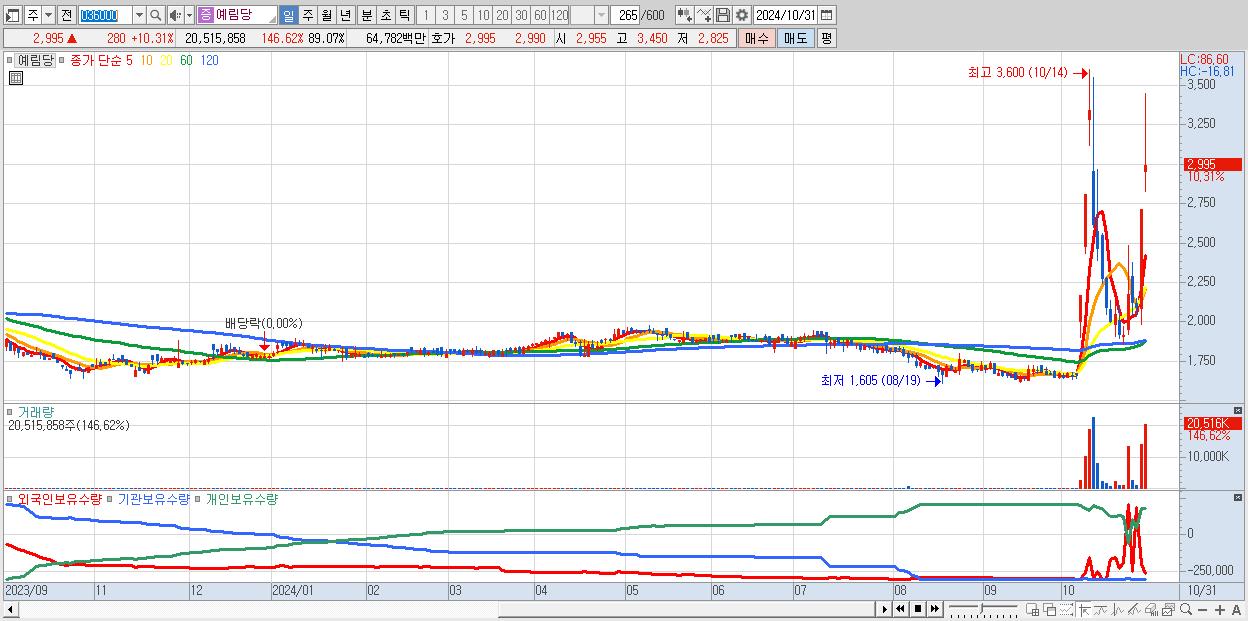 - 예림당 (2,995원 ▲ 10.31% , 시총: 690억, 거래량: 20,515,858, 거래대금:648억)