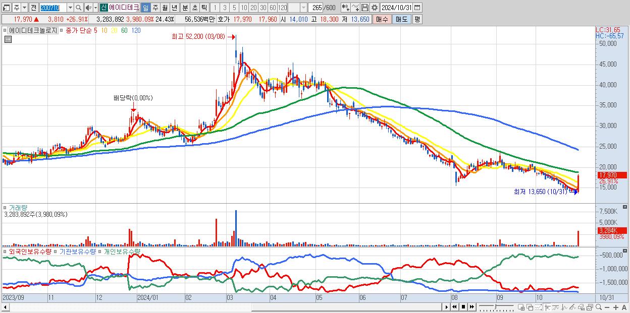 - 에이디테크놀로지 (17,970원 ▲ 26.91% , 시총: 2,415억, 거래량: 3,283,892, 거래대금:565억)