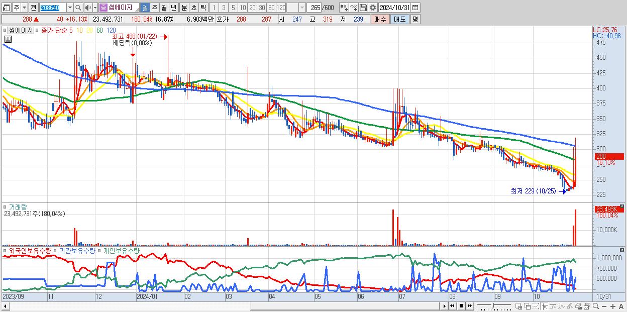 - 썸에이지 (288원 ▲ 16.13% , 시총: 401억, 거래량: 23,492,731, 거래대금:69억)