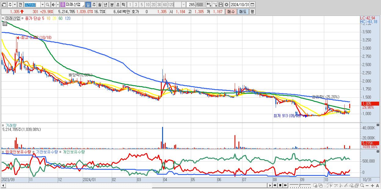 - 미래산업 (1,305원 ▲ 29.98% , 시총: 407억, 거래량: 5,214,785, 거래대금:66억)