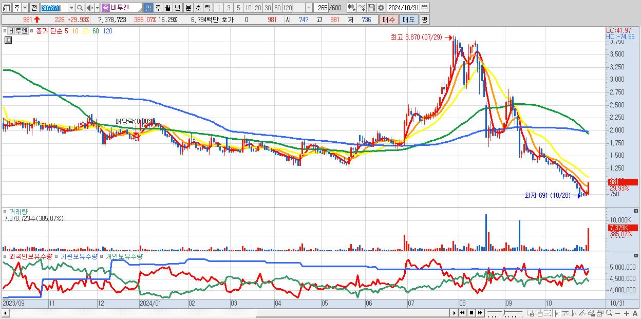 - 비투엔 (981원 ▲ 29.93% , 시총: 444억, 거래량: 7,378,723, 거래대금:68억)