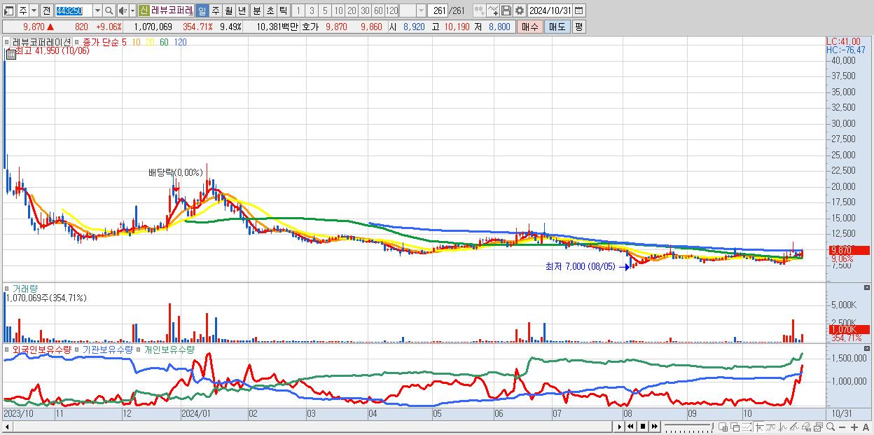 - 레뷰코퍼레이션 (9,870원 ▲ 9.06% , 시총: 1,113억, 거래량: 1,070,069, 거래대금:104억)