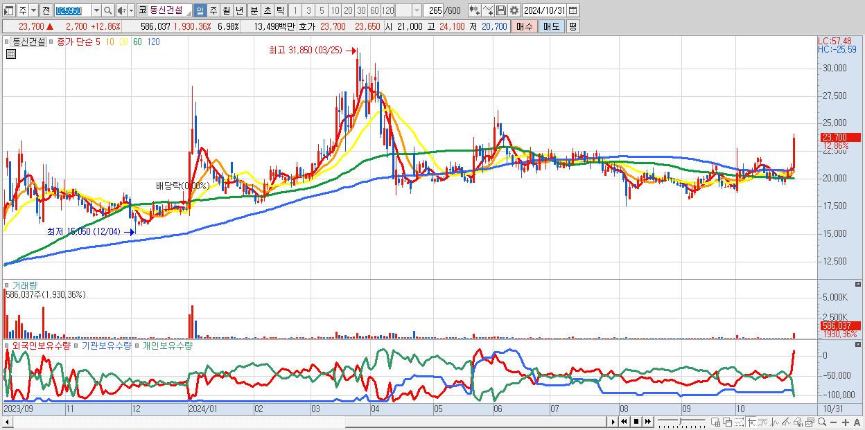 - 동신건설 (23,700원 ▲ 12.86% , 시총: 1,991억, 거래량: 586,037, 거래대금:135억)