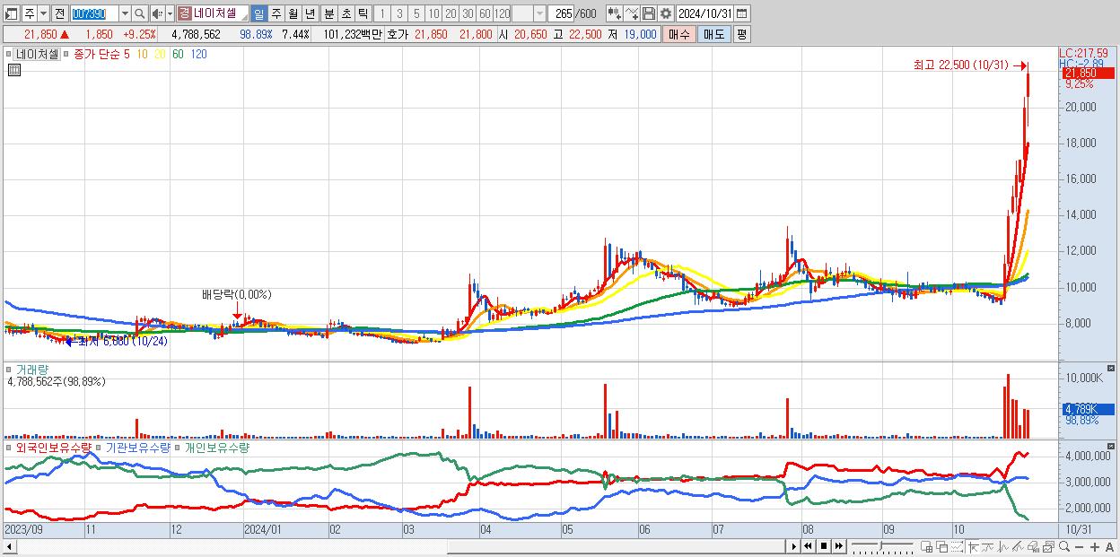- 네이처셀 (21,850원 ▲ 9.25% , 시총: 14,062억, 거래량: 4,788,562, 거래대금:1,012억)