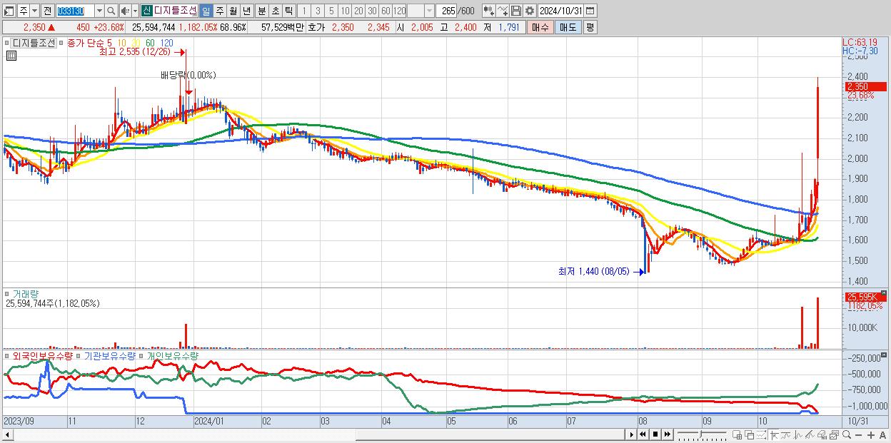 - 디지틀조선 (2,350원 ▲ 23.68% , 시총: 872억, 거래량: 25,594,744, 거래대금:575억)