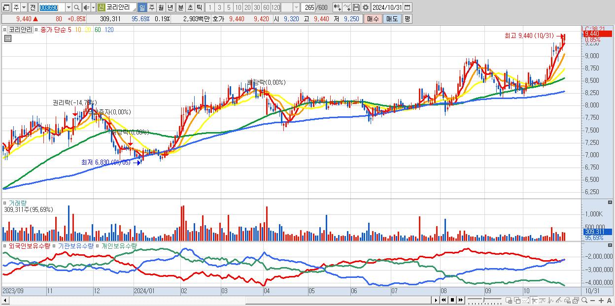 코리안리 9,440원 ▲ 0.85% (KOSPI, 003690)