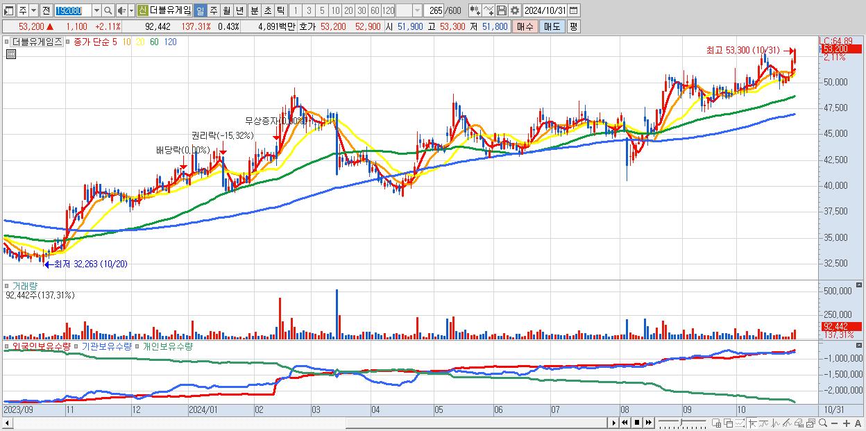 - 더블유게임즈 (53,200원 ▲ 2.11% , 시총: 11,436억, 거래량: 92,442, 거래대금:49억, KOSPI)