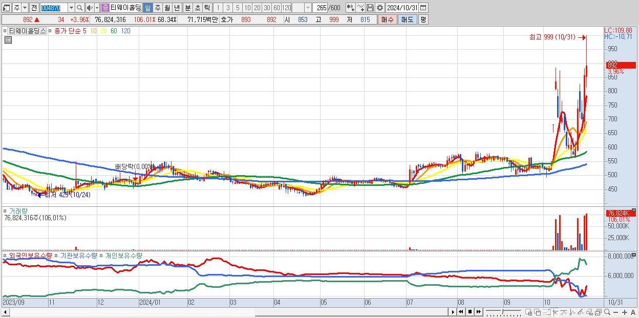 - 티웨이홀딩스 (892원 ▲ 3.96% , 시총: 1,003억, 거래량: 76,824,316, 거래대금:717억, KOSPI)